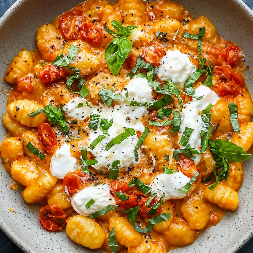 🧀 Semantic keywords naturally included: creamy tomato gnocchi, gnocchi with burrata, tomato cream sauce, quick Italian dinner, one-pan gnocchi recipe.