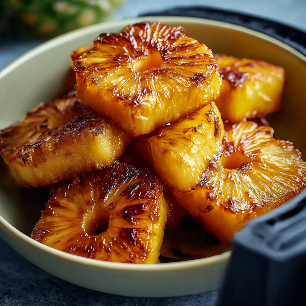 In this recipe, fresh pineapple is coated with a simple cinnamon-brown sugar glaze, then cooked in the air fryer until caramelized, golden, and slightly crisp on the edges while staying juicy inside.