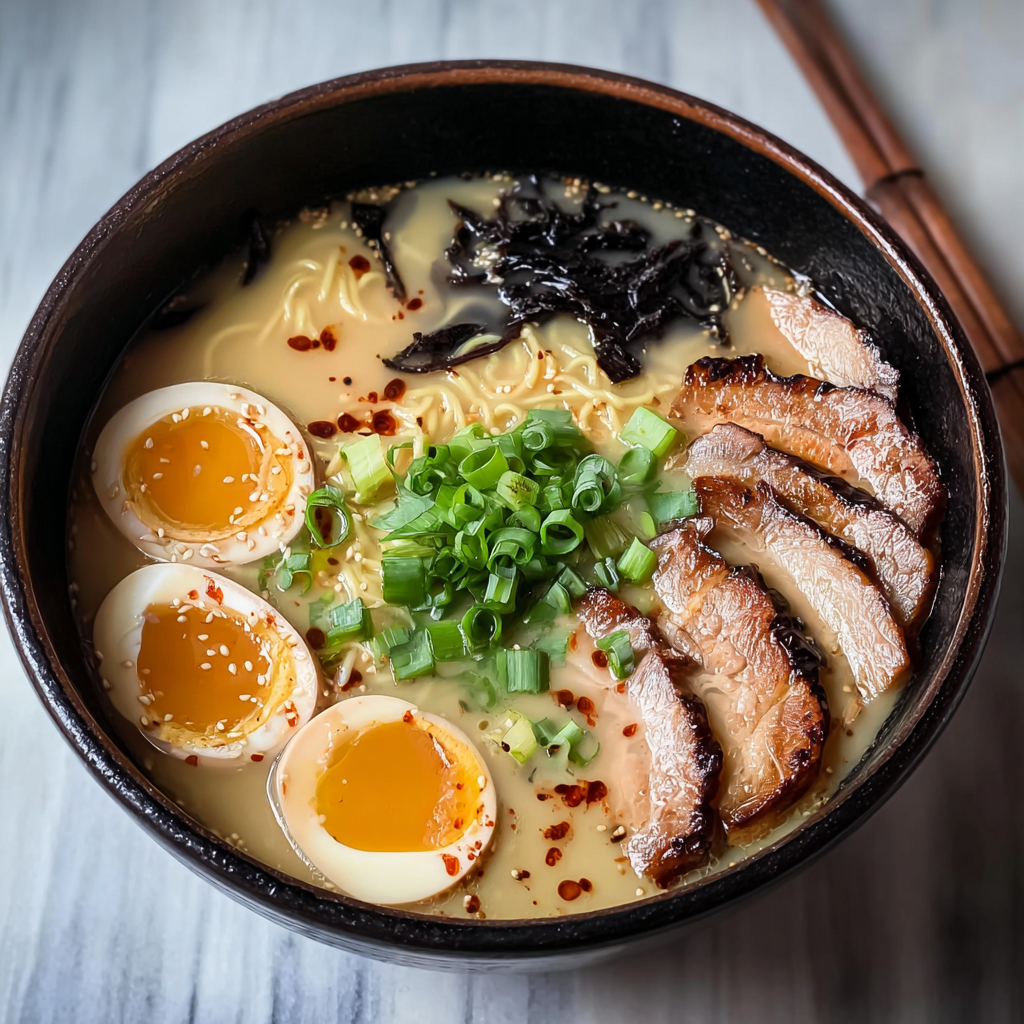 Summary: A traditional recipe for Hakata-style pork bone ramen. Features a 12-hour emulsified bone broth, soy-braised pork belly, and marinated soft-boiled eggs.