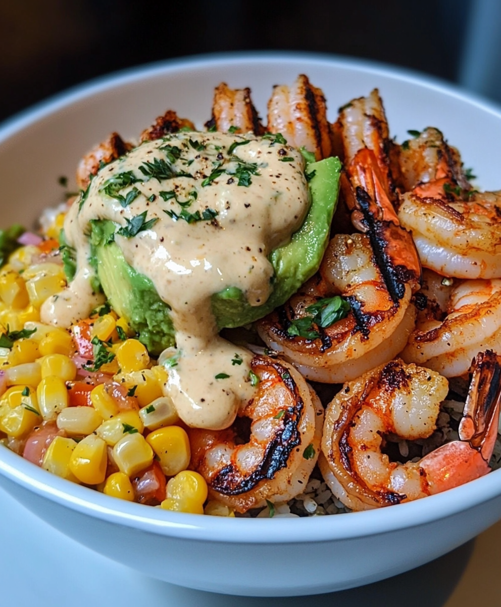 Grilled Shrimp Bowl with Avocado, Corn Salsa & Creamy Garlic Sauce