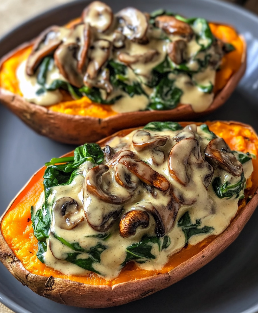 Creamy Mushroom and Spinach Stuffed Sweet Potatoes