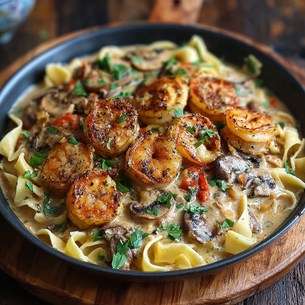 This dish takes tender shrimp coated in blackened Cajun spices, sears them until smoky and crisp, then folds them into a silky stroganoff sauce made with garlic, mushrooms, broth, paprika, and sour cream.
