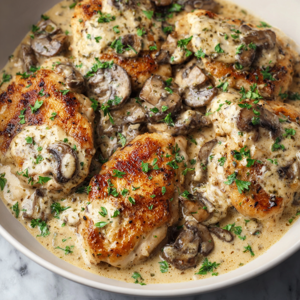 Summary: A 30-minute one-pan chicken dinner featuring seared breasts and mushrooms in a creamy, effortless sauce made from Boursin Garlic & Herb cheese.