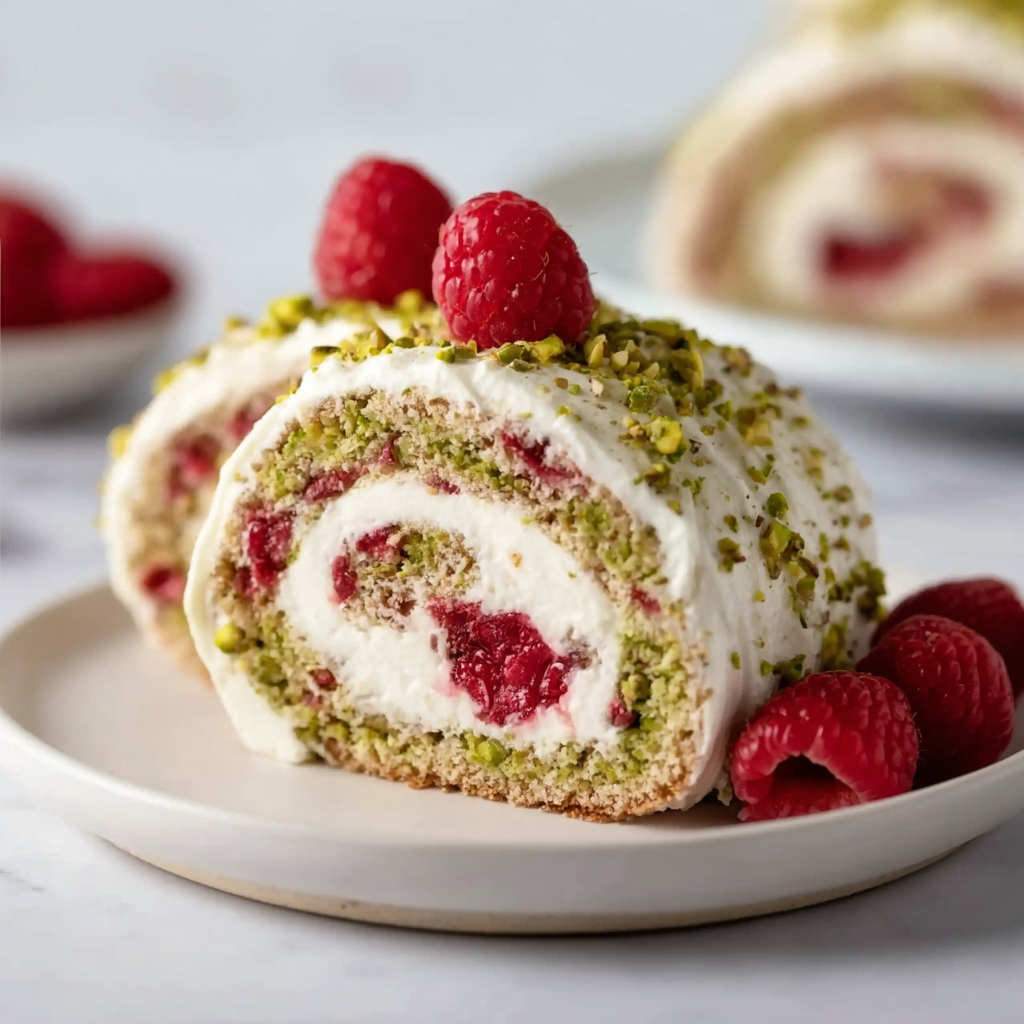 Raspberry Pistachio Swiss Roll with White Chocolate