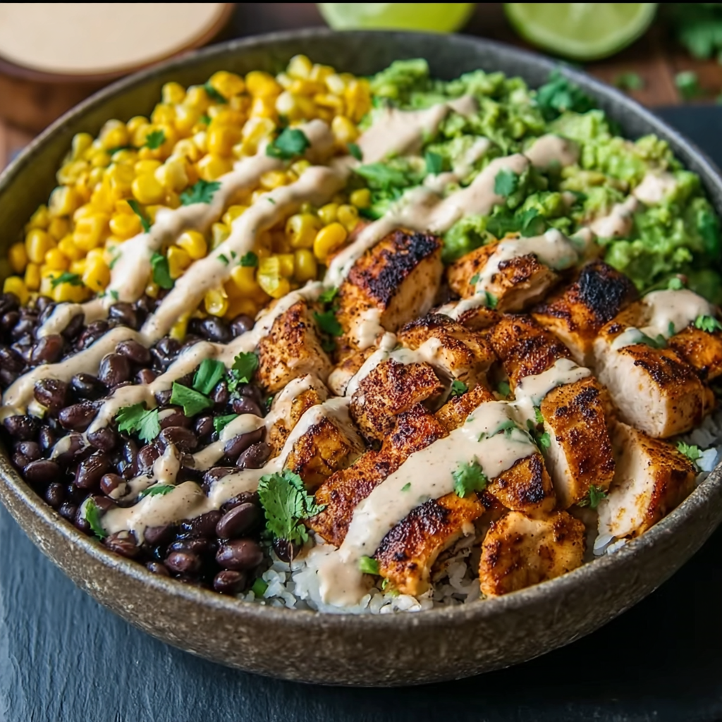 Summary: A restaurant-quality burrito bowl featuring smoky seared chicken, hearty black beans, and a zesty yogurt-based chipotle sauce. High protein, lower sodium, and budget-friendly.