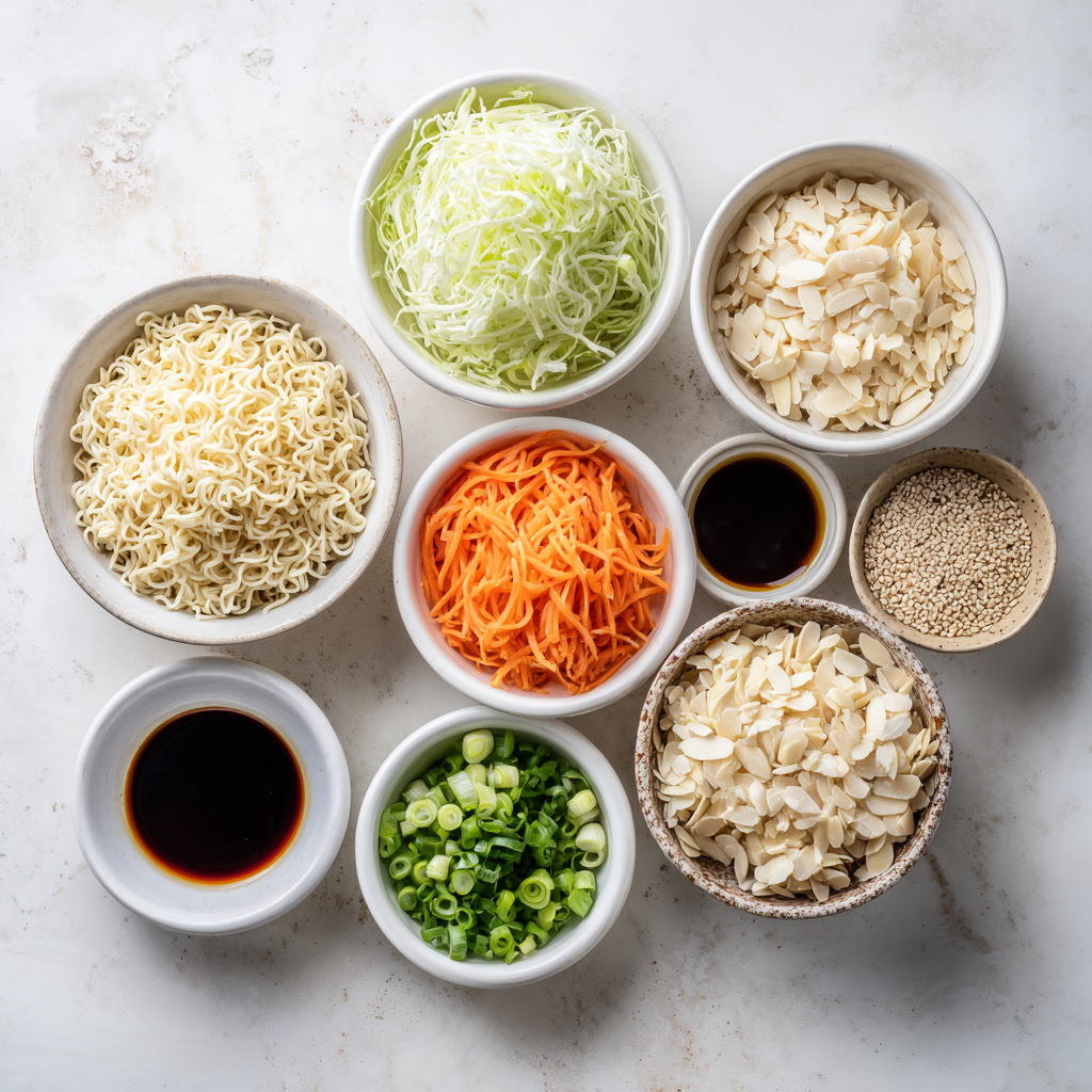 To achieve the signature sweet-tart flavor profile and lasting crunch, we separate the “wet” and “dry” components until the final moment. Here is your curated shopping list for Classic Ramen Noodle Salad.