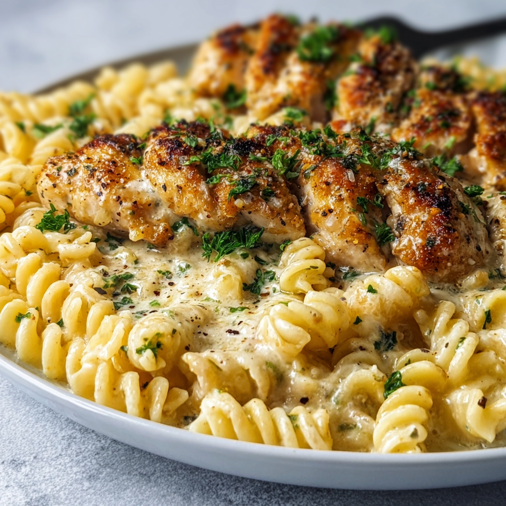 Summary: A 30-minute, high-protein comfort meal featuring seared chicken bites and rotini pasta tossed in a luxurious homemade garlic-parmesan cream sauce.