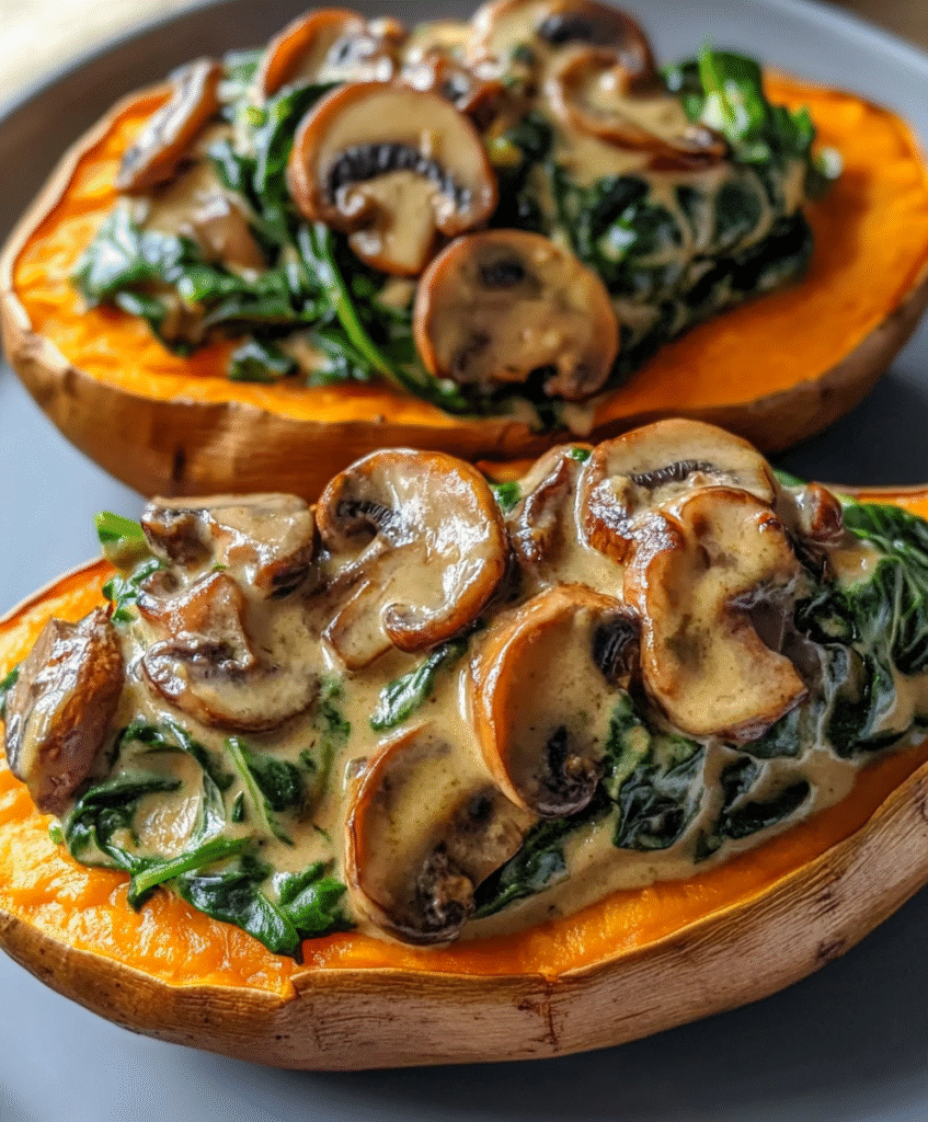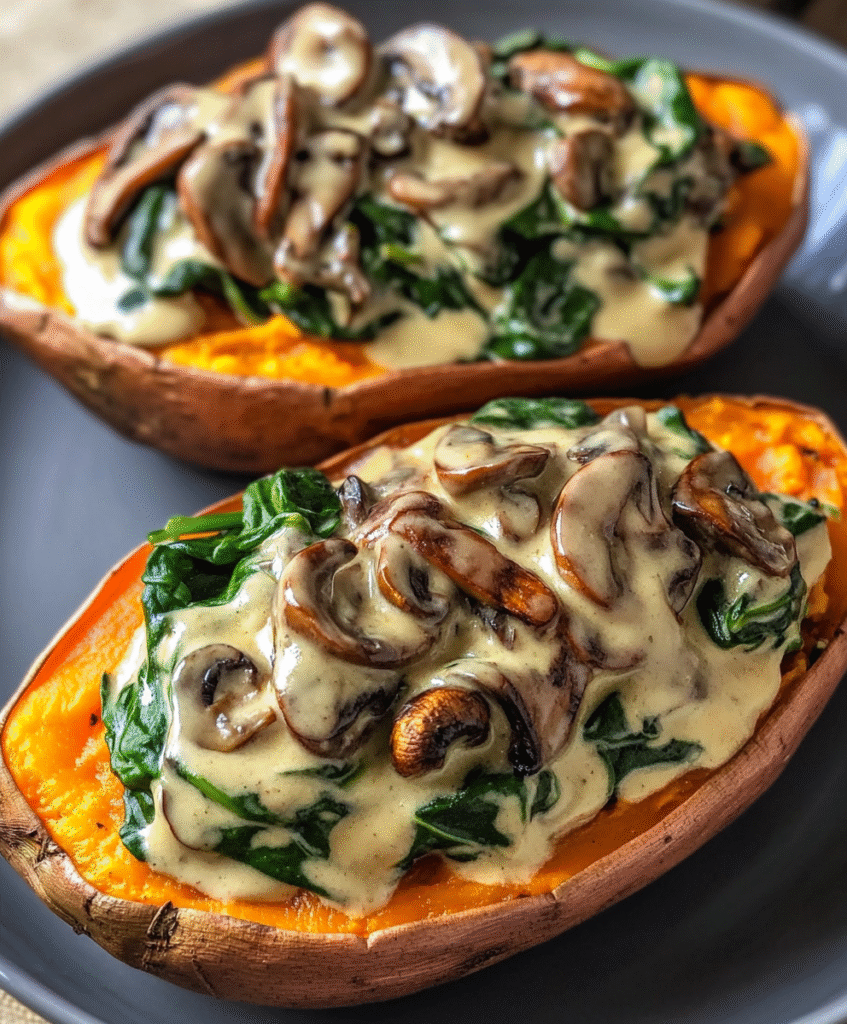 Once the sweet potatoes are tender, carefully remove them from the oven. Slice them open lengthwise, being careful not to cut all the way through the bottom. Fluff the flesh slightly with a fork. Spoon a generous amount of the creamy mushroom and spinach filling into the opening of each potato.