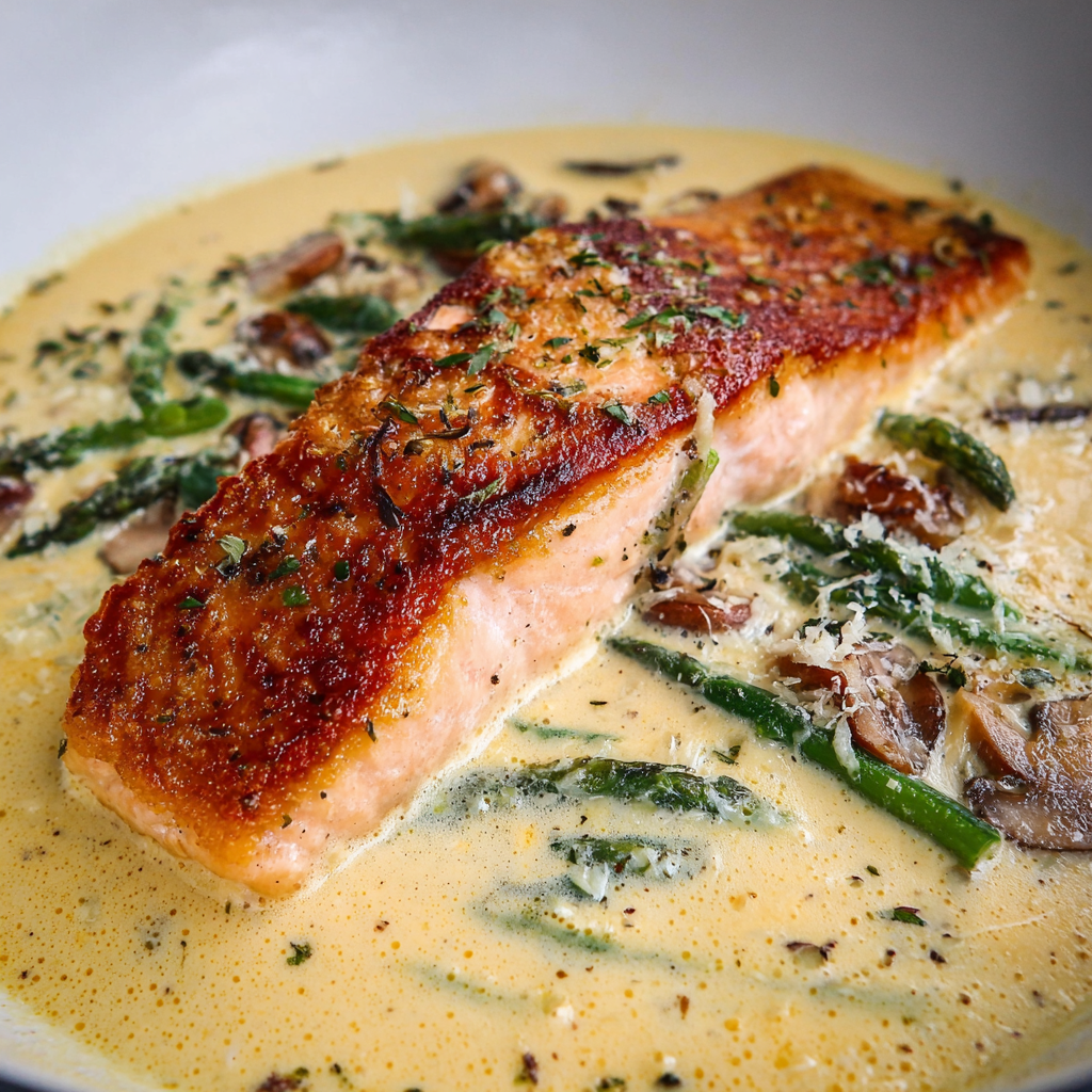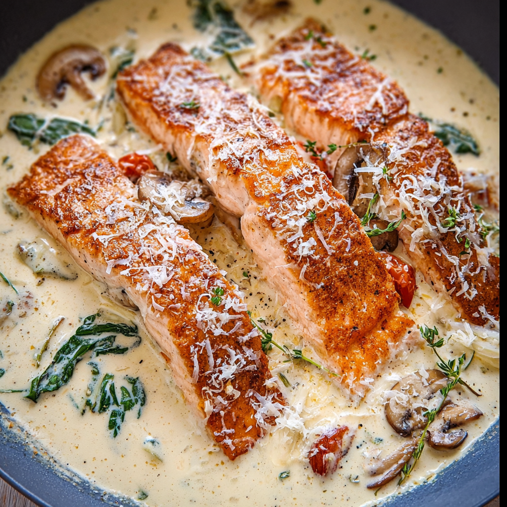 The salmon is first pan-seared to create a Maillard reaction (browning) on the exterior, which traps internal moisture. It is then finished in a cream-based emulsion. The acidity from the sun-dried tomatoes and the calcium from the Parmesan cheese interact with the dairy proteins, creating a velvety sauce that clings to the salmon, preventing the fish from drying out—a common failure in oven-baked recipes.