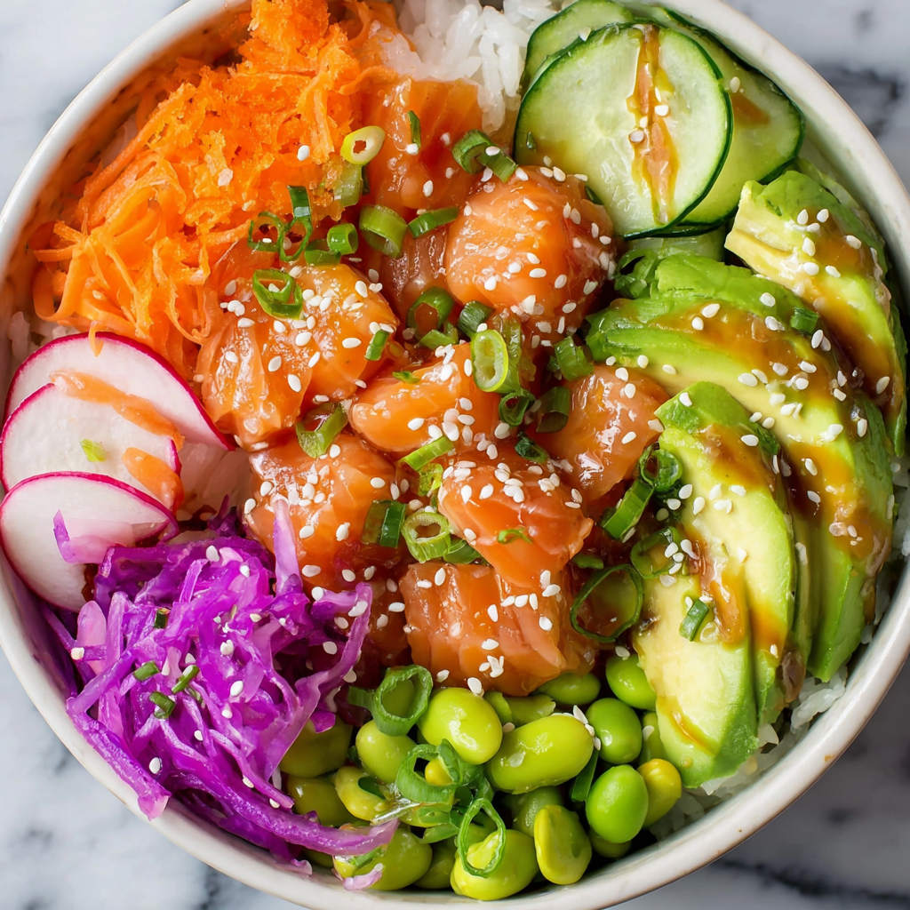Summary: A fresh, customizable bowl featuring marinated sushi-grade salmon, seasoned sushi rice, creamy avocado, and crunchy edamame. Cheaper and fresher than takeout.