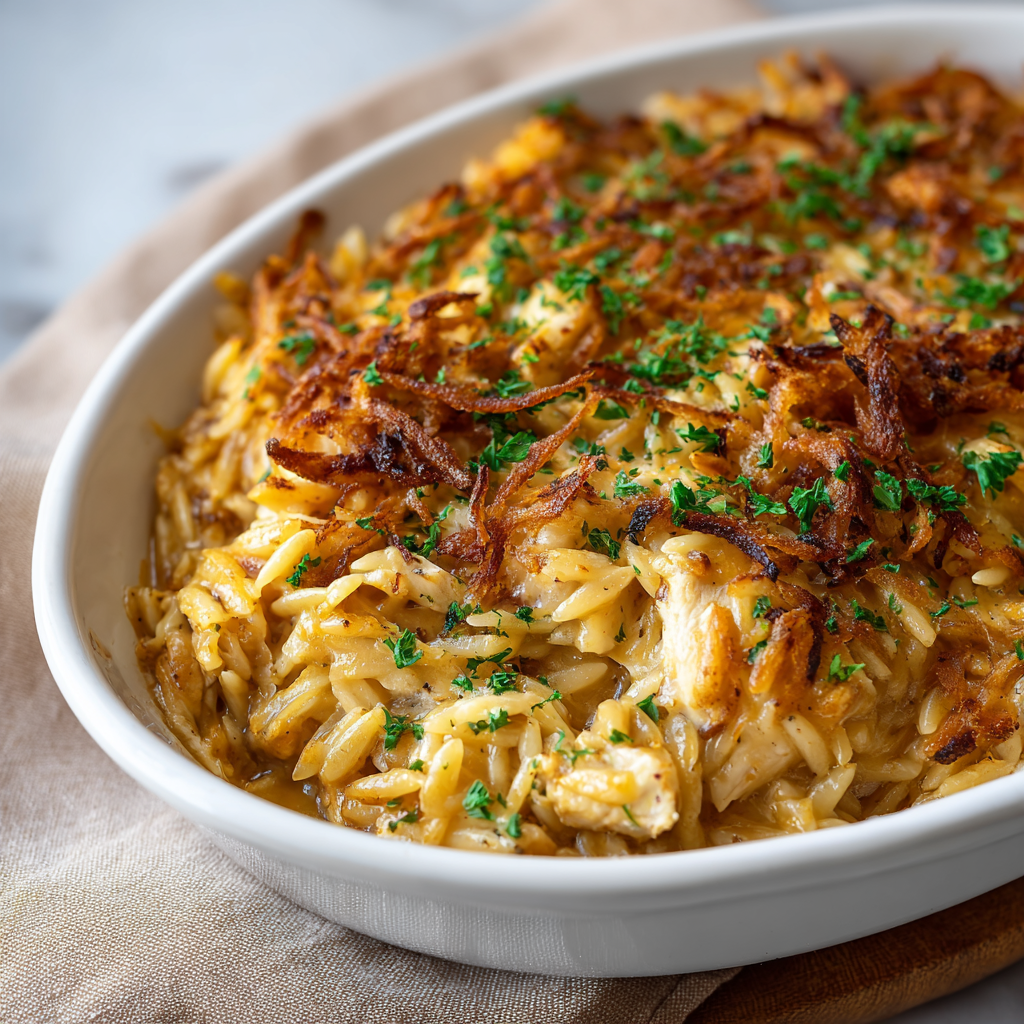 French Onion Chicken Orzo Casserole is sophisticated enough for a Saturday night dinner party but simple enough for a Tuesday. It delivers all the nostalgic flavors of the famous soup—sweet onions, salty broth, nutty cheese—turned into a satisfying, fork-friendly meal.