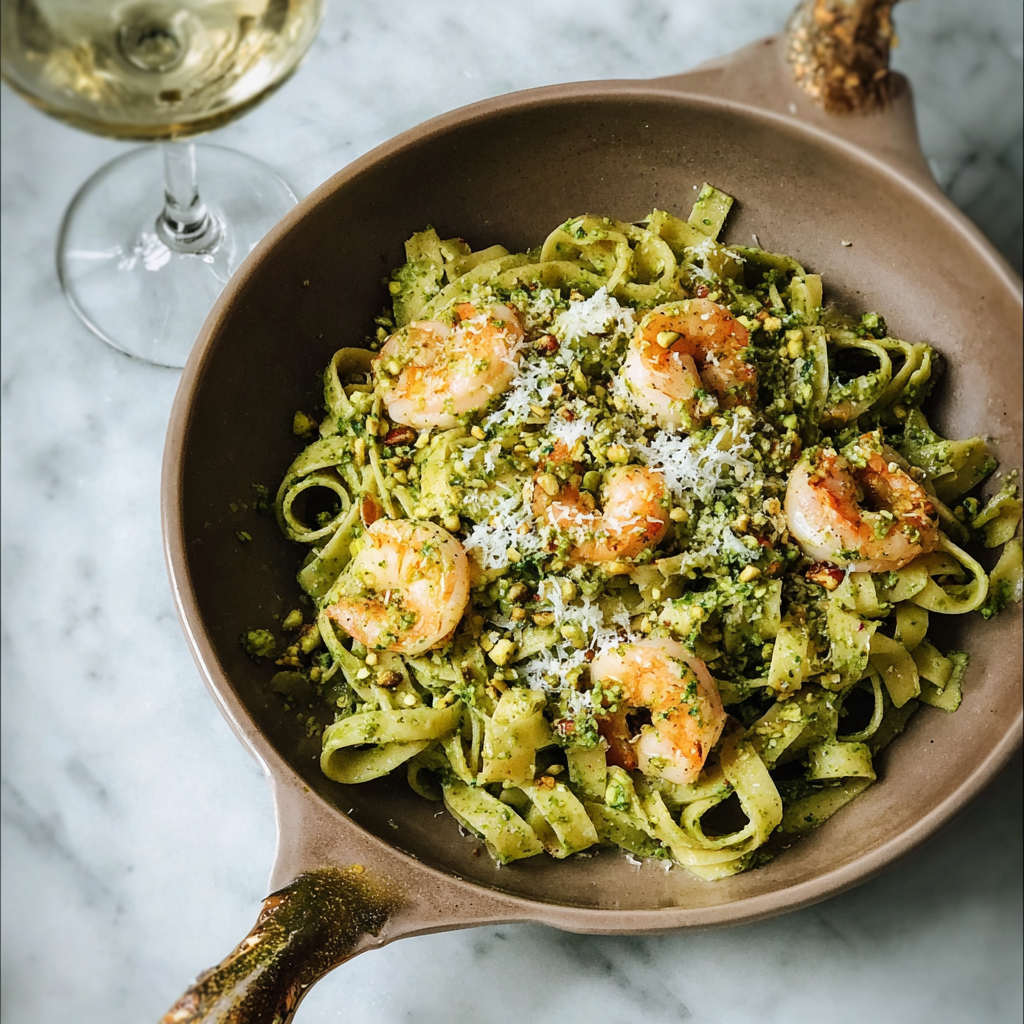 Add the undercooked pasta to the skillet with a splash of the reserved pasta water. Toss over medium heat for 60 seconds. Turn off the heat entirely. Add the cilantro-pistachio pesto and the prawns. Fold gently. The residual heat of the pasta will “awaken” the pesto without destroying its fresh flavor.