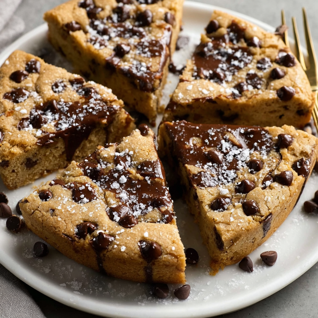 There is no scooping, no rolling, and no multiple trays going in and out of the oven. You simply press all the dough into a single cake pan or skillet and bake. The result is structurally superior to a normal cookie: the edges get golden and chewy, while the center remains thick, soft, and slightly gooey. It slices like a pizza and eats like a dream.