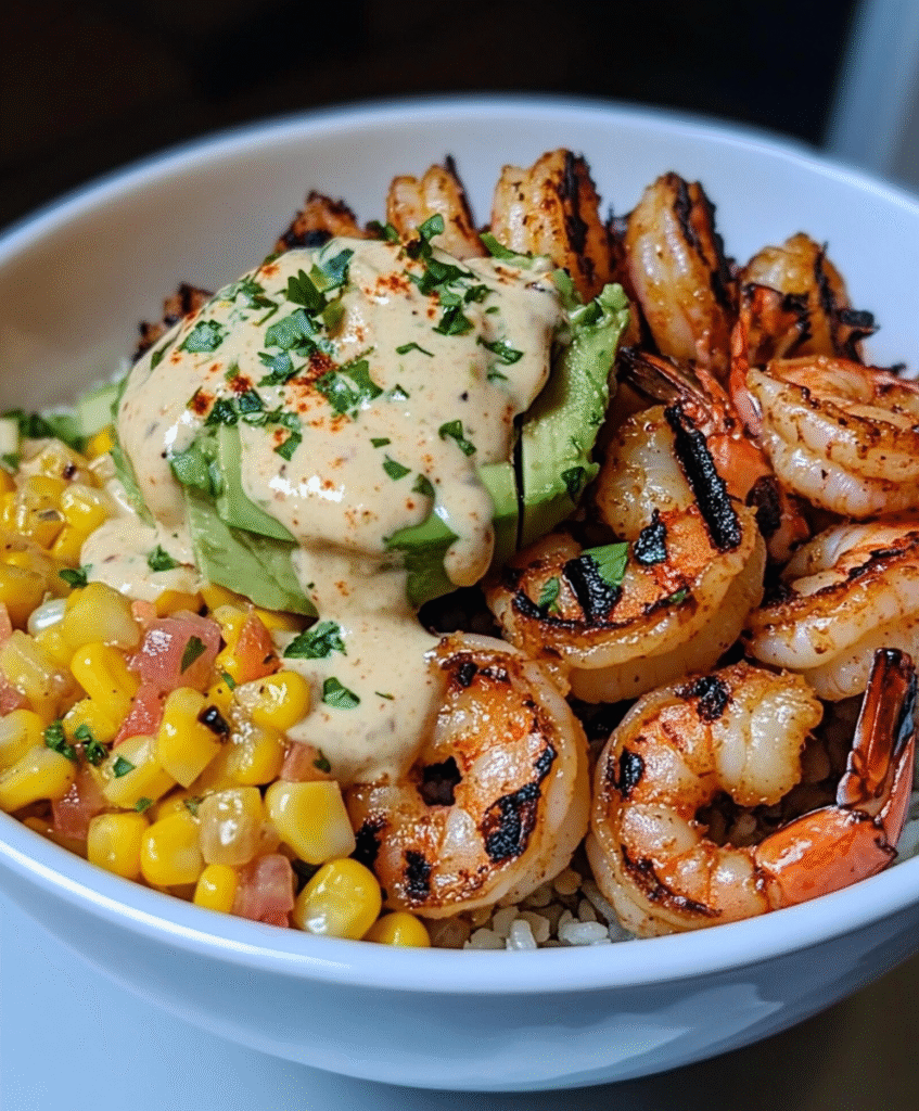 This Grilled Shrimp Bowl is a fresh, vibrant, and satisfying meal that combines tender grilled shrimp, a bright corn and black bean salsa, and a luscious creamy garlic sauce. It’s perfect for a light lunch or a flavor-packed dinner, offering a great balance of lean protein, healthy fats, and fiber.
