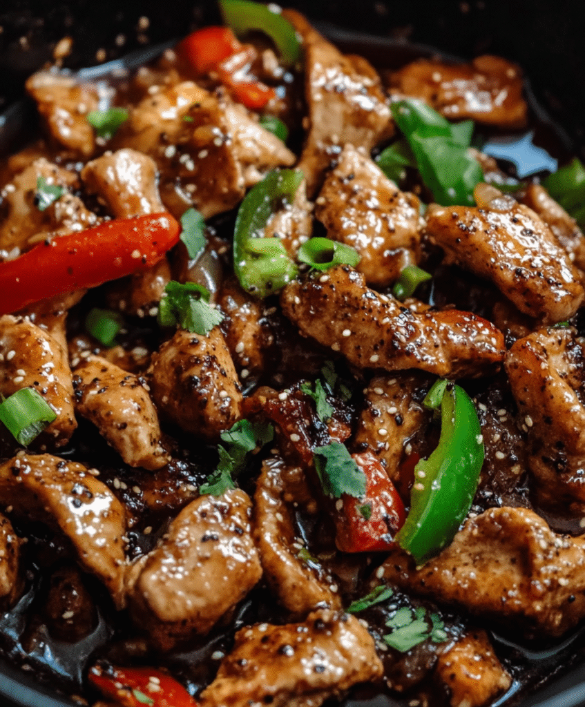 Return the cooked chicken to the pan. Pour in the sauce and toss everything together. Stir-fry for another 2–3 minutes until the sauce thickens and coats the chicken beautifully. You’ll know it’s done when the aroma of black pepper fills the air.