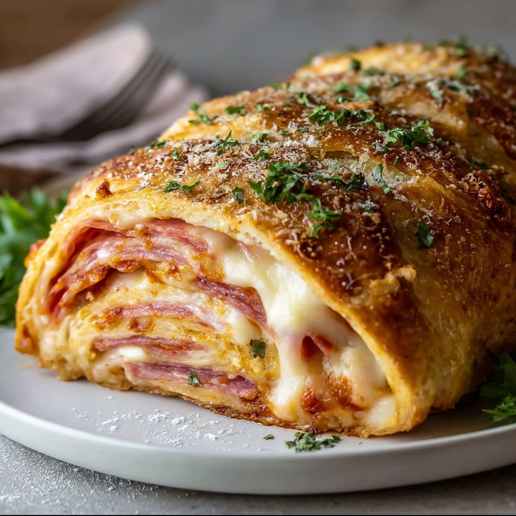 Summary: A rolled, stuffed bread filled with salami, pepperoni, ham, and mozzarella cheese. Baked until golden and served with marinara. Perfect for parties or family dinner.