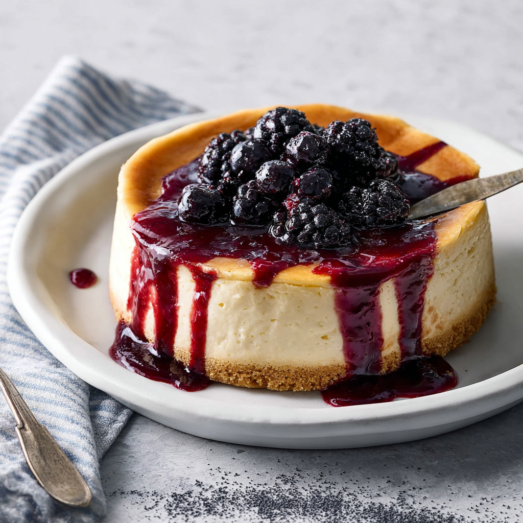 Summary: A crustless, high-temperature cheesecake infused with Earl Grey tea and vanilla, featuring a caramelized top and a creamy center. Served with tart blackberry sauce.