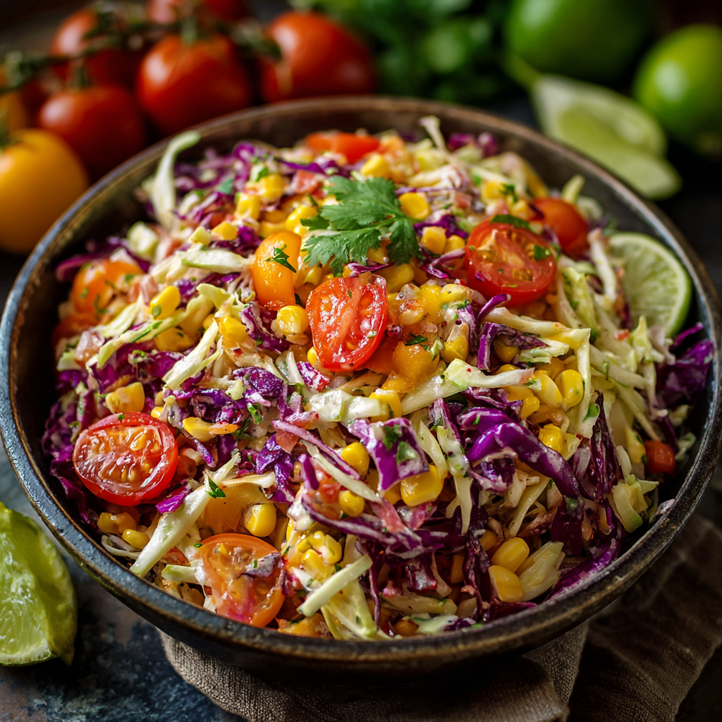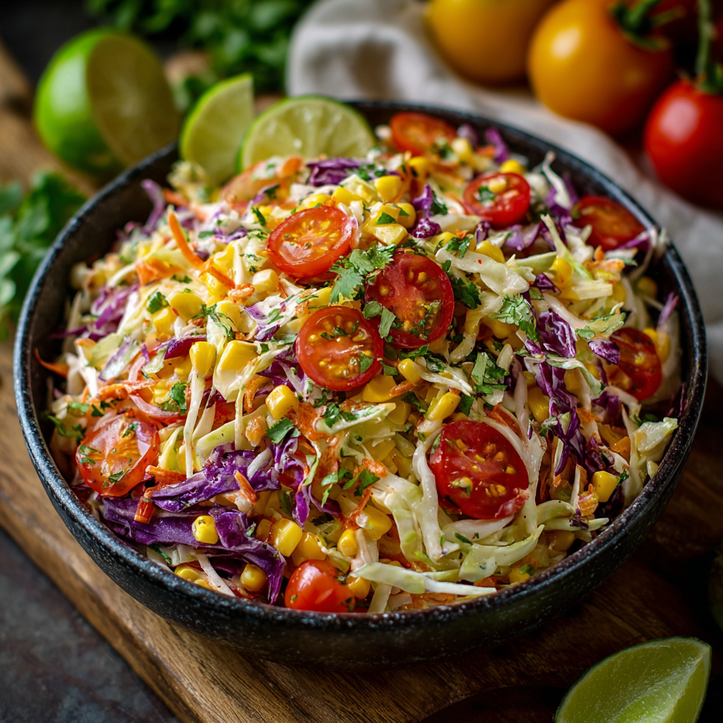Unlike traditional coleslaw made with heavy mayonnaise dressing, this Mexican-style coleslaw features crisp cabbage, sweet corn, juicy tomatoes, and a tangy lime dressing that delivers bold flavor without weighing the dish down. Inspired by Mexican street food and fresh market ingredients, this salad is perfect for tacos, grilled meats, barbecues, or healthy lunches.