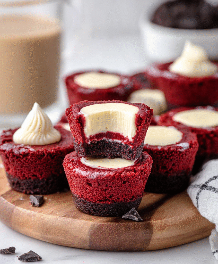 Creamy, velvety, bite-sized cheesecakes with a rich cocoa-red velvet base and silky cream cheese topping — elegant, fun, and dangerously delicious.
