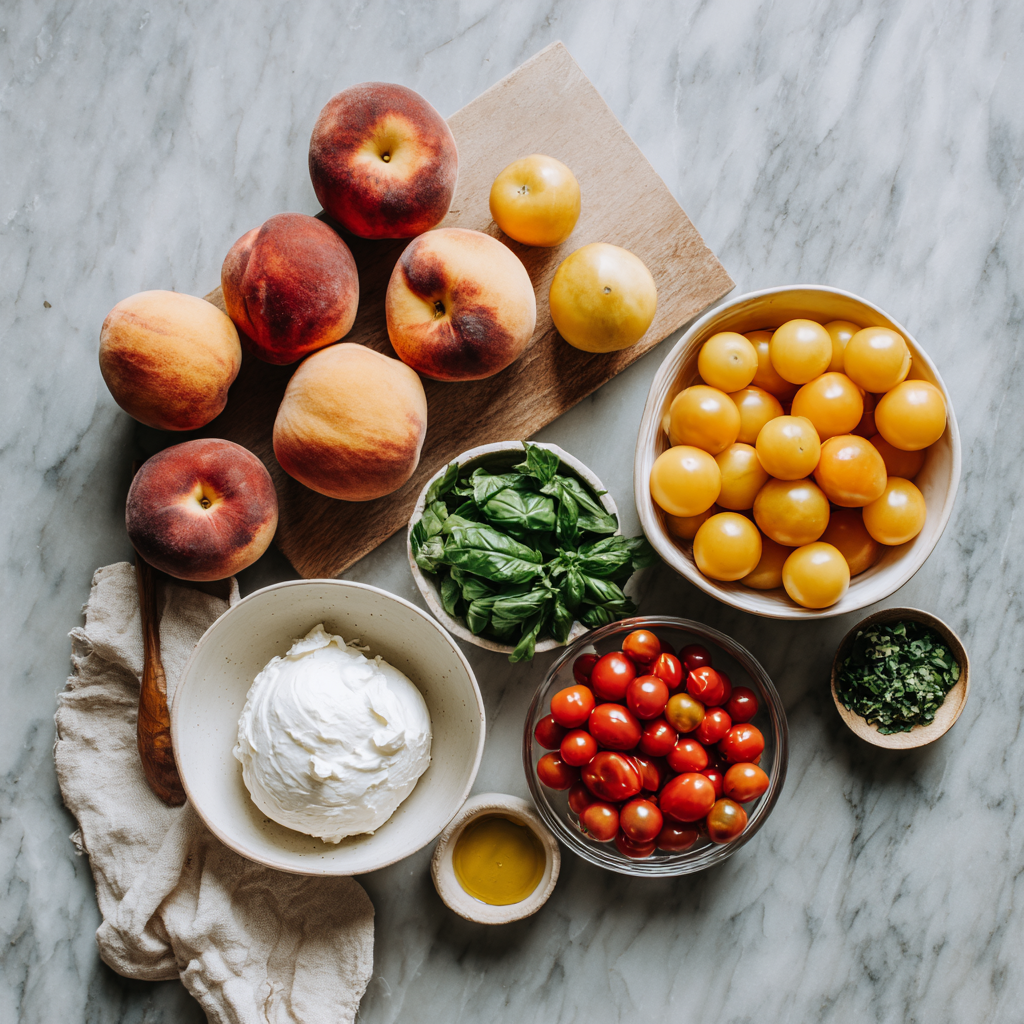 To achieve a salad that isn’t watery or bland, ingredient quality is non-negotiable. Here is your curated shopping list for Peach Caprese Salad with Burrata.