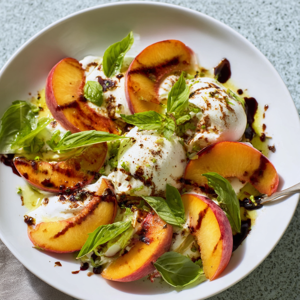 Summary: A 15-minute summer salad featuring sliced heirloom tomatoes, fresh peaches, and creamy burrata cheese, finished with basil and balsamic glaze. Vegetarian and gluten-free.