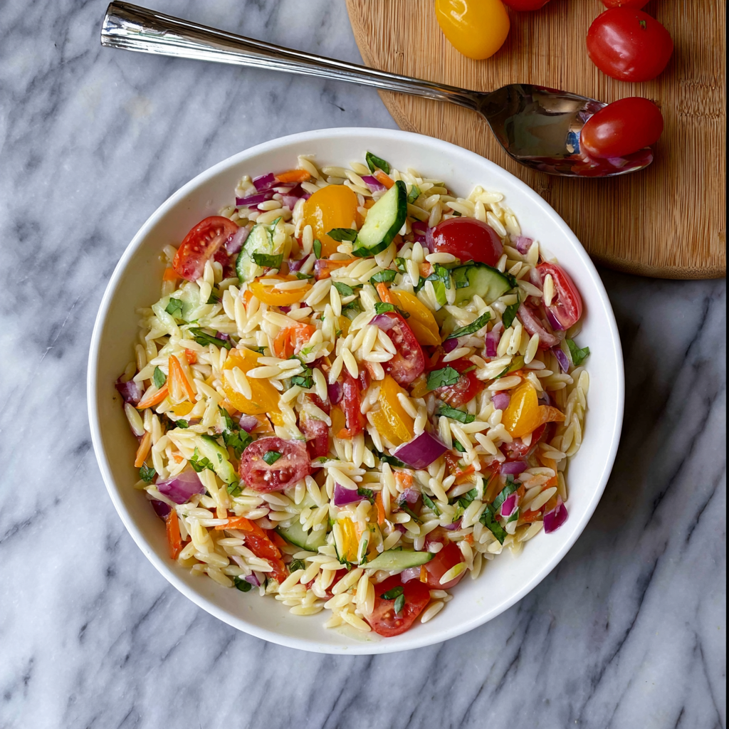Did you know that according to nutritional “Eat the Rainbow” data, consuming a wide variety of plant colors in a single sitting increases the diversity of your gut microbiome by up to 20%? While many pasta salads rely on heavy, cream-based dressings that lead to post-lunch “brain fog,” the Rainbow Orzo Salad utilizes the principles of complex carbohydrate loading and high-moisture vegetables. By pairing the rice-shaped orzo with a spectrum of high-crunch aromatics, you create a dish that is statistically more satiating than traditional salads. This recipe is a data-backed solution for those who crave a meal that is fresh, crunchy, and structurally stable enough for a week of meal prep without losing its texture.