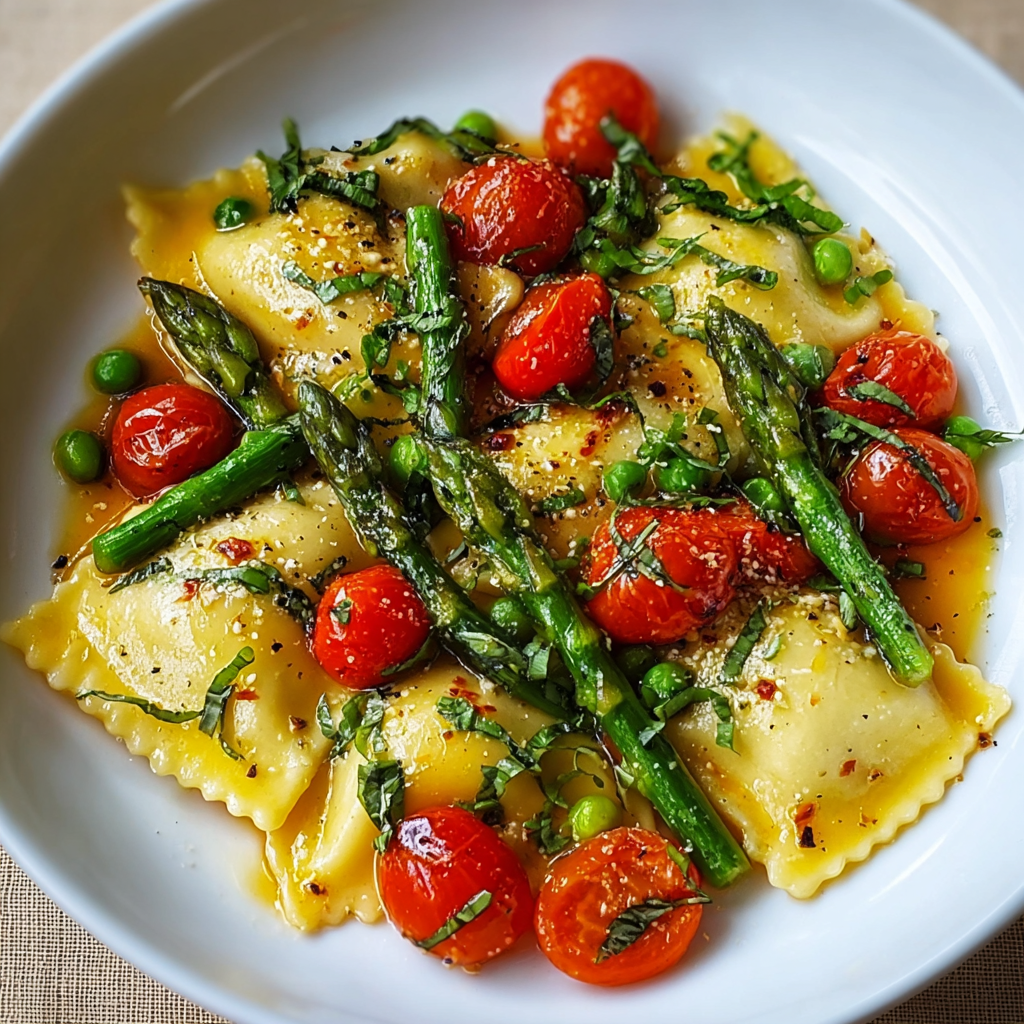 Ravioli with Asparagus, Cherry Tomatoes & Fresh Herbs is a vibrant, fresh pasta dish perfect for quick dinners or elegant meals. With crisp vegetables, aromatic herbs, and tender ravioli, it delivers Italian-inspired flavor in just 25 minutes. Try it today, leave a comment with your feedback, and subscribe for more delicious recipes!