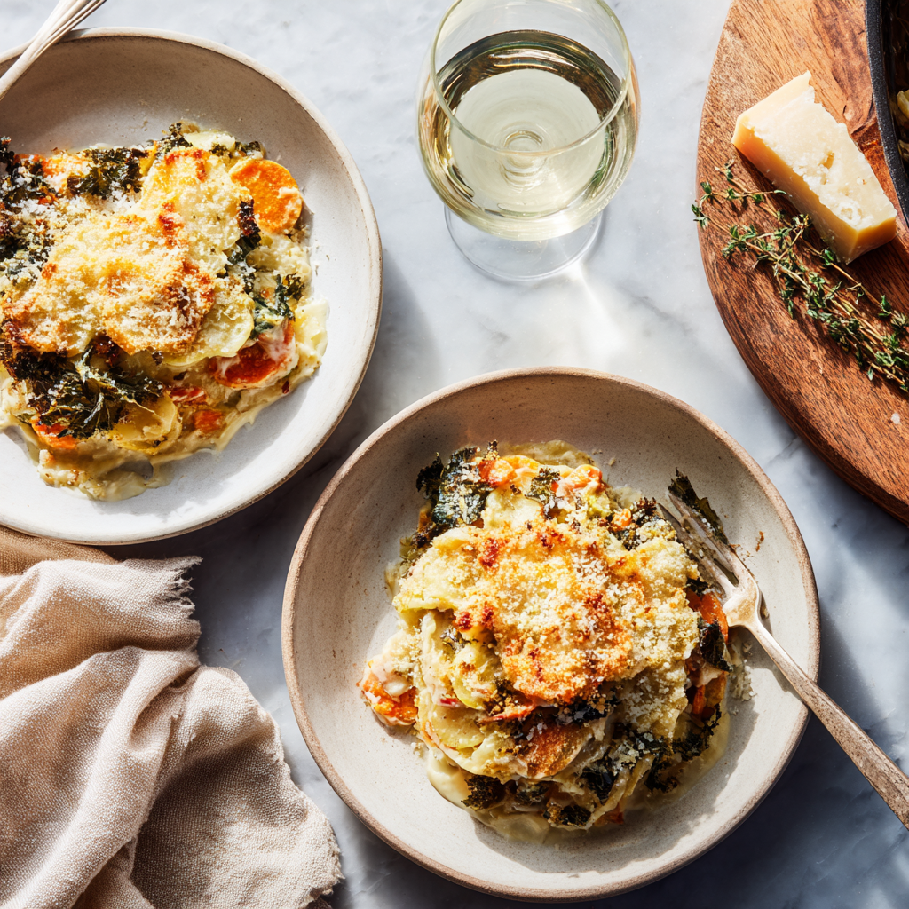 Summary: A creamy, cheesy bake featuring thinly sliced sweet potatoes, parsnips, and beets layered with fresh kale and Gruyère cheese.