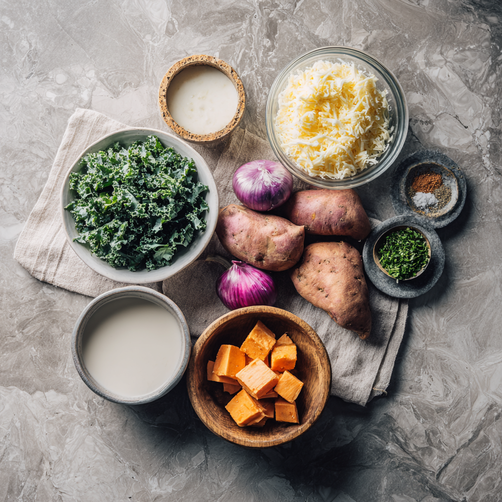 Data Insight: By including kale and sweet potatoes, this dish provides massive amounts of Beta-Carotene and Vitamin K. The fat in the cream is functionally necessary here, as Vitamin A and K are fat-soluble vitamins, meaning your body absorbs them significantly better in the presence of lipids.