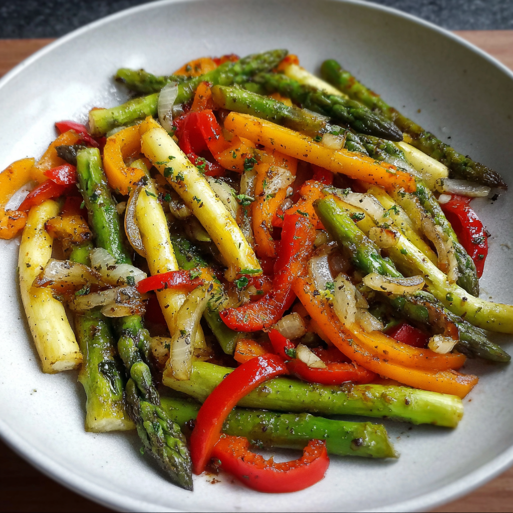 Summary: A 20-minute, vegan, and keto-friendly side dish featuring crisp asparagus, sweet red peppers, and onions sautéed with garlic and lemon.
