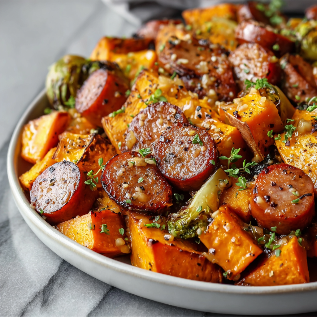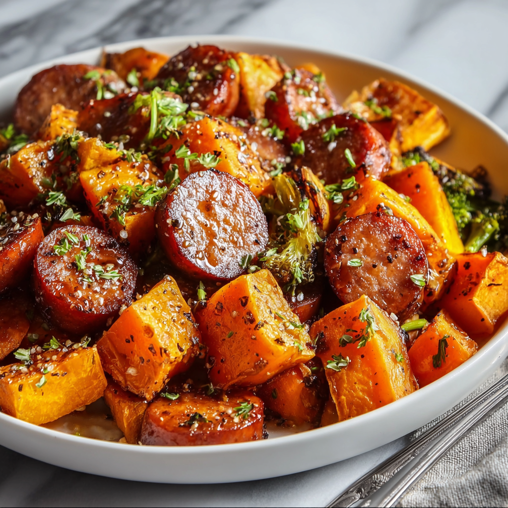 Summary: A one-pan dinner featuring smoked sausage, cubed sweet potatoes, and broccoli roasted in a sticky honey-soy-garlic glaze.