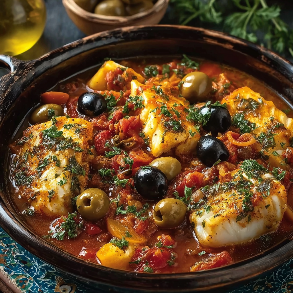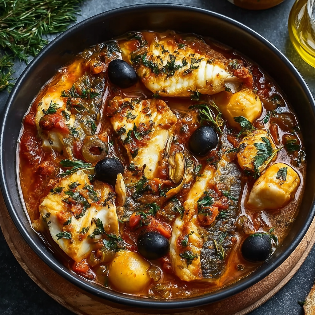 This Sicilian-Style Fish Stew proves otherwise. Rooted in Southern Italian coastal cuisine, this rustic dish combines tender white fish, tomatoes, garlic, olives, capers, and fresh herbs into a rich, aromatic broth that tastes like it simmered all day—yet comes together in under an hour.