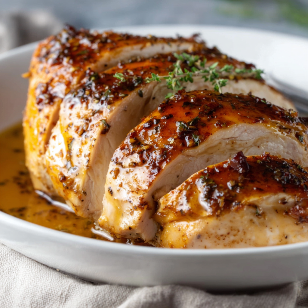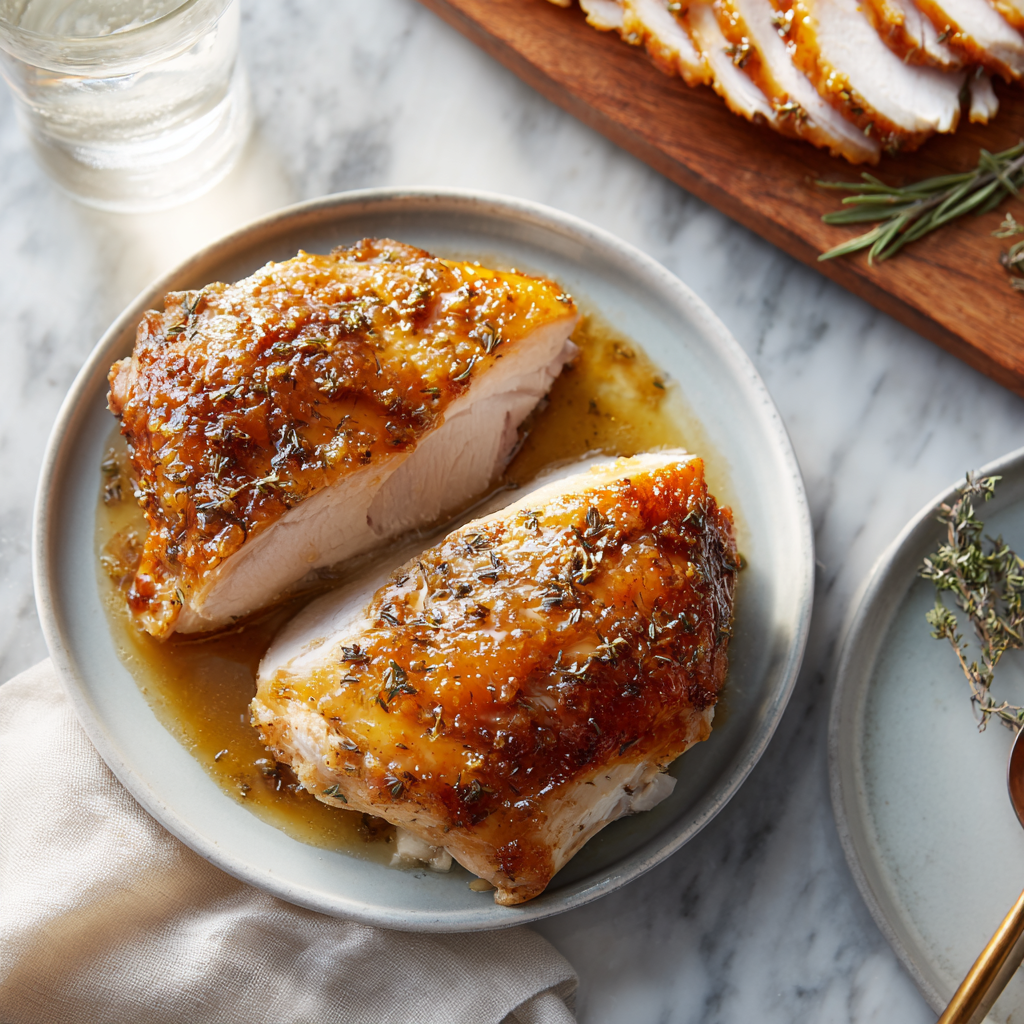 Summary: A tender, bone-in turkey breast slow-cooked with pure maple syrup, butter, and herbs. Includes instructions for a crispy finish.