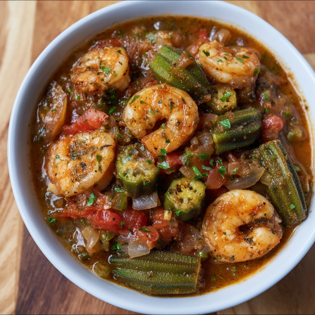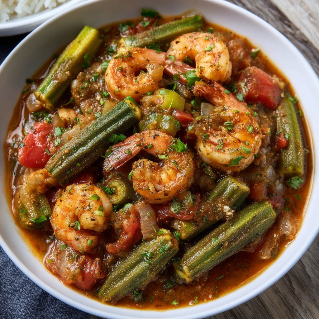 Summary: An authentic, one-pot Southern recipe featuring okra, the “Holy Trinity” of vegetables, bacon, and shrimp simmered in a rich tomato gravy. No slime, just flavor.