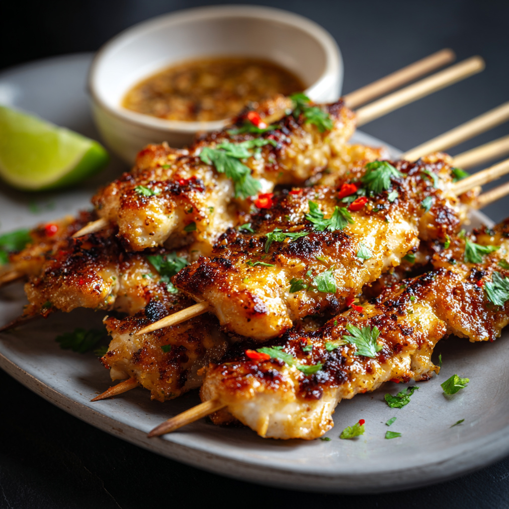 Home » Thai Coconut Chicken Skewers with Peanut Sauce 🥥🔥: The Science of “Lipid-Based Heat Transfer”