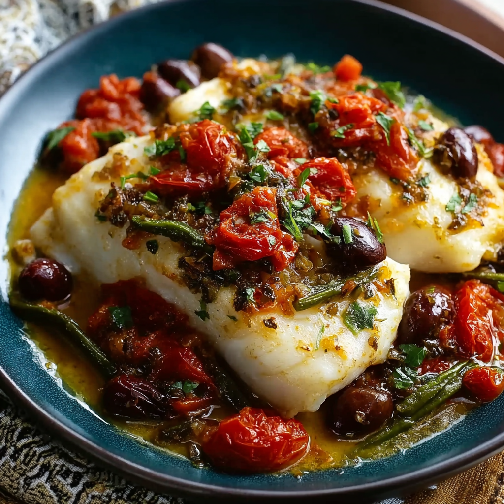 The technical challenge is the “Sear-to-Silk” Ratio: achieving a Maillard-crusted exterior while preserving the structural integrity of the large, moist flakes. By utilizing a Mediterranean “Aromatic Cap” (olives, capers, and tomatoes), you introduce high-acidity buffers that cut through the rich, fatty lipids of the fish.