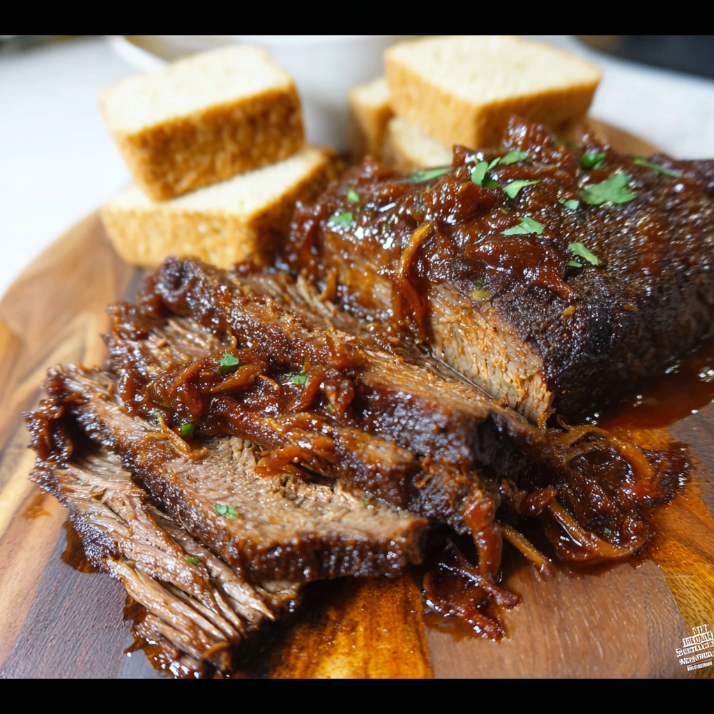 Carefully remove the brisket (it will be fragile). Skim the fat from the juices in the pot and whisk in the remaining BBQ sauce. Brush this “Power-Glaze” over the brisket and place it under an oven broiler (grill) for 5 minutes. This “Flash-Caramelization” creates the sticky, professional “bark” texture.