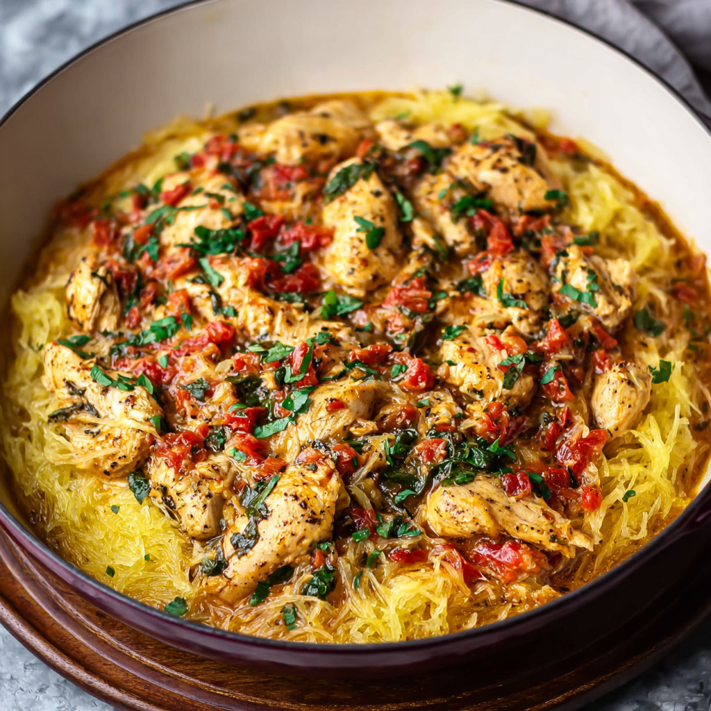Tender chicken simmered in a rich garlic-Parmesan cream sauce with sun-dried tomatoes and spinach, served over roasted spaghetti squash instead of pasta — it’s a wholesome twist on the classic Tuscan dish.
