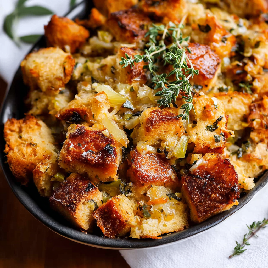 • Cold Butter Finish: The trick to the ultra-crispy crust is dotting the top with cold butter cubes just before baking. As the stuffing bakes uncovered, this butter melts, saturating the top layer and frying the bread into golden, crispy submission.