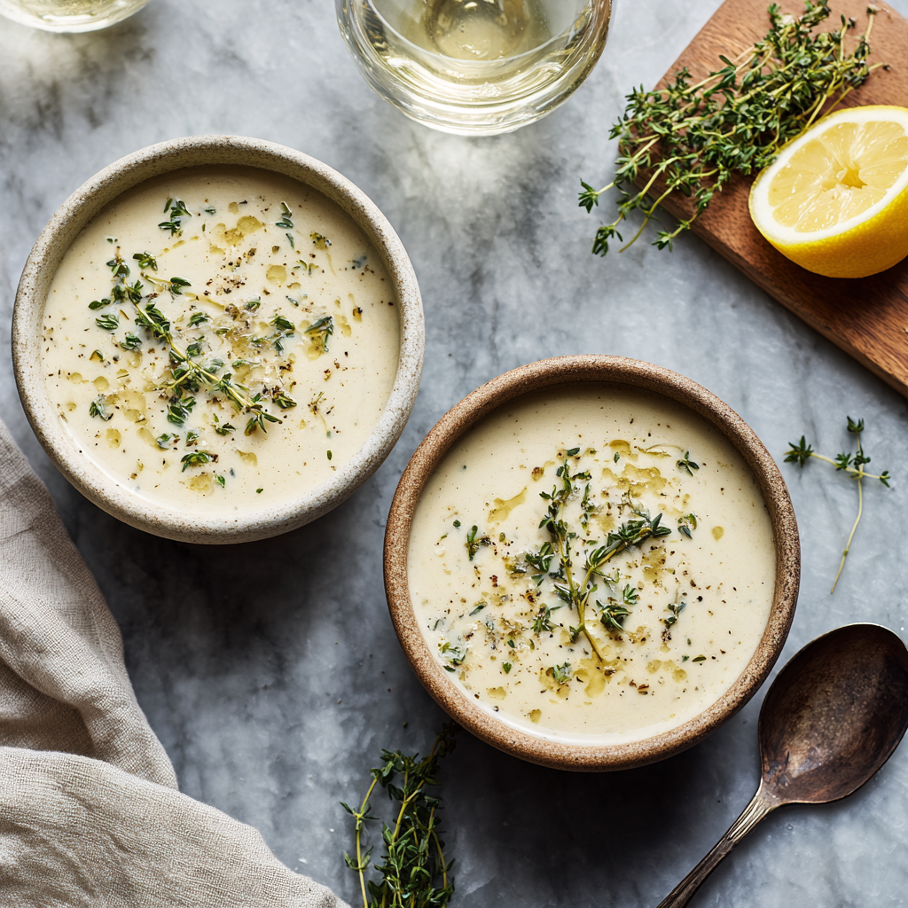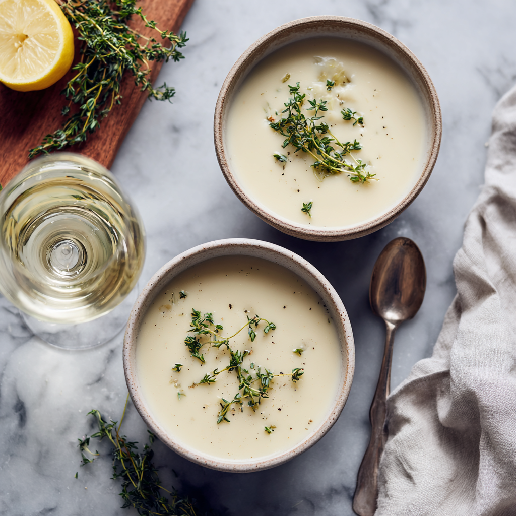 Summary: A sophisticated, creamy soup for two featuring artichoke hearts and potatoes, blended and strained for a velvety texture. Finished with thyme and cream.
